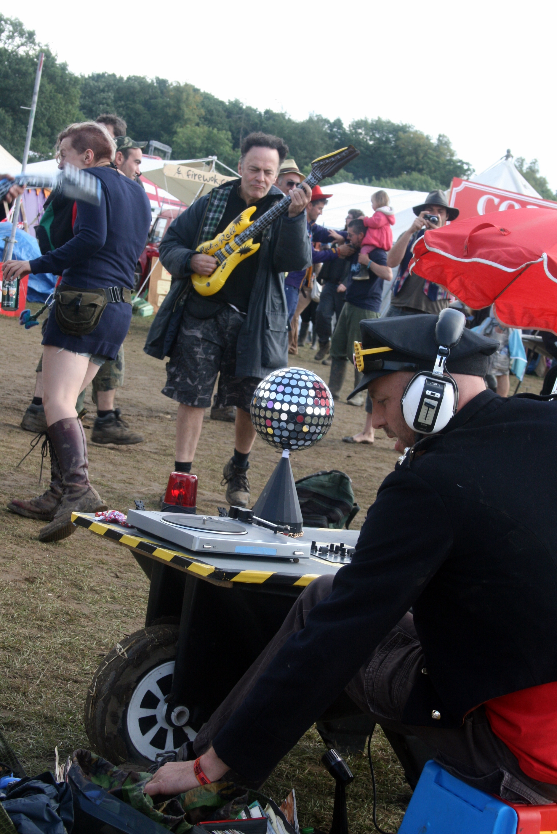 Sunday morning I spent an hour sorting through tunes and ended up selecting some heavy metal and rock music as I had not heard any all weekend. I set up near the information and property lock-up tents as these were busy but with not much going on. No sooner had I started than a group of people carrying inflatable air guitars stopped and joined in. As one would imagine this was a really rockin’ gig with musicians, punks, children, ravers and random passers by all joining in and going a bit la-la with the inflatables. To get us further into character we were wearing fake ‘bandito’ moustaches and 70s facial hair, groovy. My final appearance was on Sunday evening near the lake and sand pit where I met photographer Damian Prestidge and had a chance to do a mini-photo shoot in return for explaining a few tips and secrets of keeping it wheel…