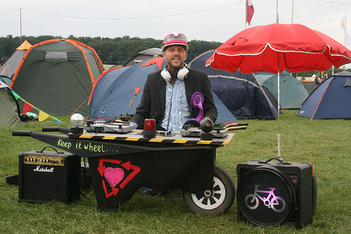 I started up near the main arena Friday morning a full day earlier than last year. Pretty soon the sun came out and people started to stop and dance, laugh and bop about. A couple of kids who also found me on Sunday stayed for quite a while at the end and couldn’t believe that everything was found at the recycling centre even the mixer and music! I also met ____ for a second time this year, he is a young local musician and journalist who plays and reviews festivals. He tells me all the best festivals are in the West Country and that I should go to Sunrise next year he’s also written about me on his blog so I am looking forward to reading what he says as he’s obviously a future talent