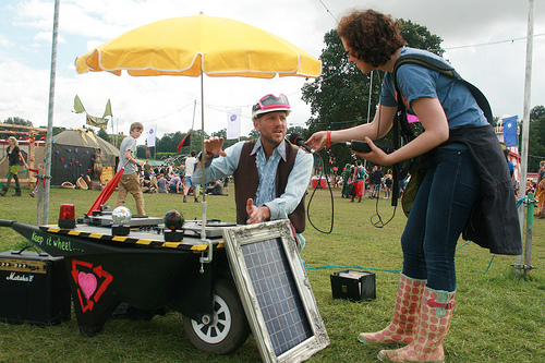 There are two main DJ’ing options it’s also possible to combine them both. An award winning Full-On Festival creation called Tip of the Pops solar-powered wheelbarrow disco. It mainly plays classic 7″ vinyl records and can pop-up anywhere. The basic sound system consists of an upcycled suitcase that is suitable for around 50 guests. This act can be walk-about, warm-up or the main event. I can even do a popular kids disco with bubble machine and nursery rhymes.